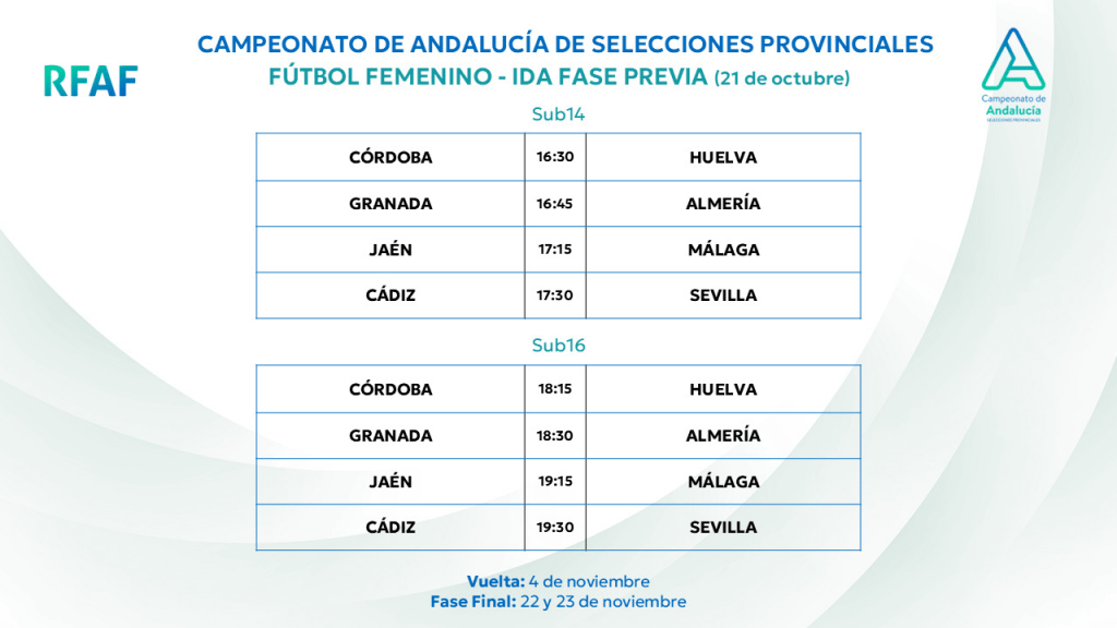 Este 21 de octubre arranca el Campeonato de Andalucía de Selecciones Provinciales femeninas en categorías Sub-14 y Sub-16, una competición esencial para seguir el desarrollo del talento base en la comunidad. La fase previa se disputará a doble partido: ida el martes 21 de octubre y vuelta el martes 4 de noviembre.