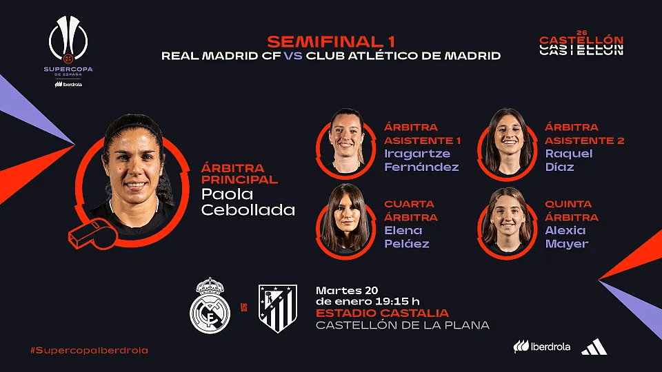 Cebollada López, nacida en Alicante y residente en Aragón, será la responsable del derbi entre Real Madrid y Atlético de Madrid, que abrirá el torneo este martes a las 19:15 horas (La 2). Por su parte, Calvo Valentín pitará el Barcelona-Athletic Club, previsto para el miércoles a las 19:00. Ambas árbitras cuentan con experiencia en partidos de máxima exigencia y estarán acompañadas por equipos arbitrales igualmente preparados.