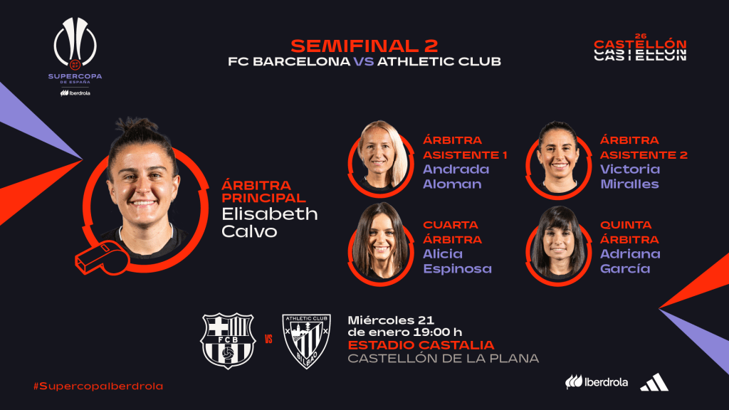La Real Federación Española de Fútbol ha anunciado este lunes las designaciones arbitrales para la Supercopa de España Femenina, que se disputa en Castellón del 20 al 24 de enero. Paola Cebollada López y Elisabeth Calvo Valentín serán las encargadas de dirigir las semifinales, en una edición marcada por la apuesta por el rigor y la tecnología.