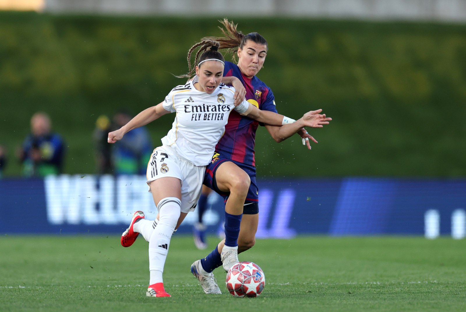 Con un dominio absoluto de la posesión, el Barça construía el juego con paciencia desde la zaga y poco a poco iba encerrando más y más al Madrid en su área. Las blancas se mostraban especialmente combativas cada vez que tenían la ocasión de arrebatarle el cuero a sus rivales, buscando salir a la contra con velocidad.