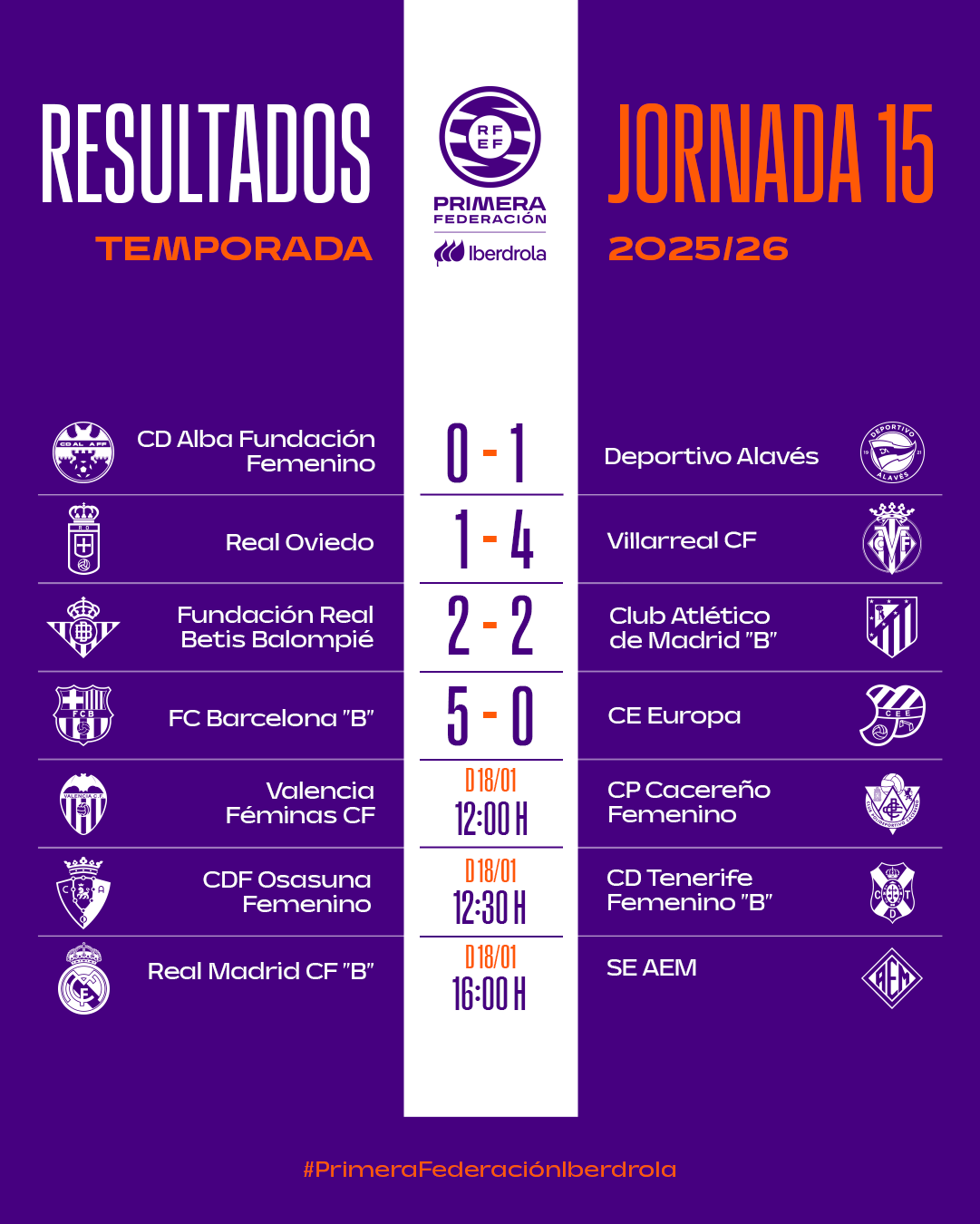 La jornada 15 de la Primera Federación Iberdrola ha dejado claro que el Deportivo Alavés no está dispuesto a soltar el trono. Las vascas se impusieron por la mínima (0-1) al CD Alba Fundación en Albacete, gracias a un tanto de Paula León en el minuto 32, y se aseguran así una semana más en lo más alto de la tabla.