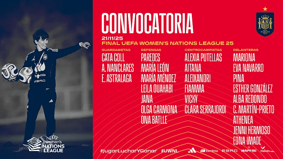La seleccionadora Sonia Bermúdez ha anunciado la lista de convocadas para la final de la UEFA Women’s Nations League 2025, que se disputará el 21 de noviembre. Un bloque sólido y reconocible, con algunas caras nuevas, buscará coronarse en la segunda edición del torneo.