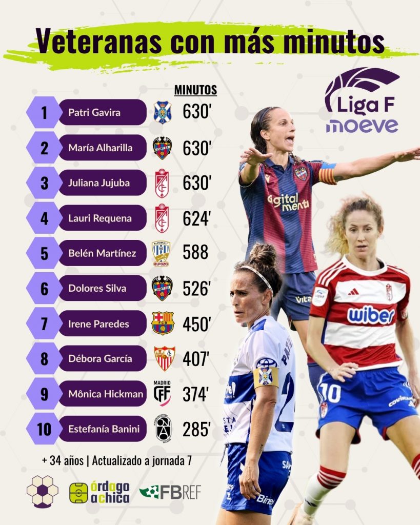 Las jugadoras veteranas con más minutos en Liga F (2025/26)