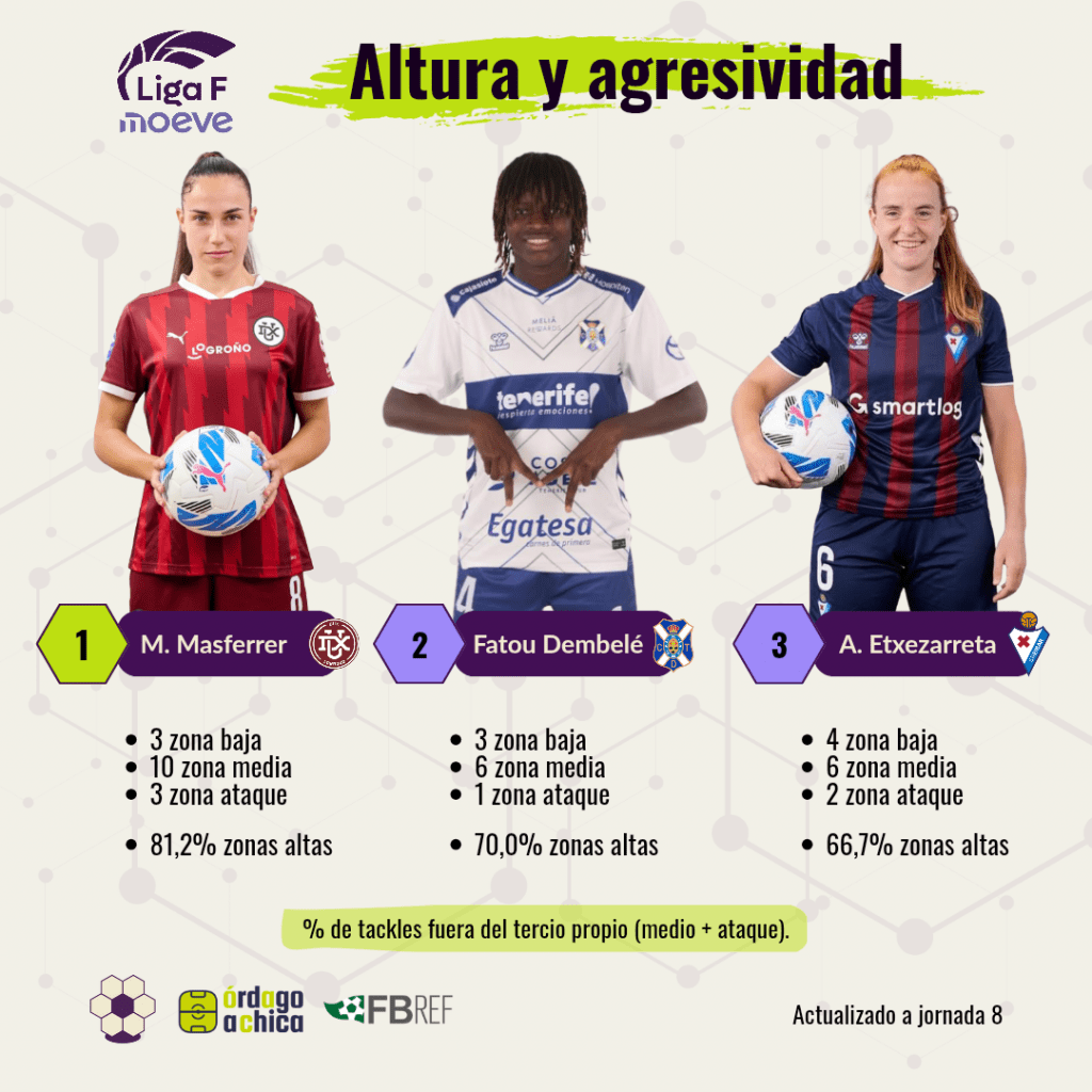 - Nuria Garrote (FC Badalona Women) — 32 (4.78/90’); Intercepciones: 11 (1.64/90’); TklW/90’ 2.24
