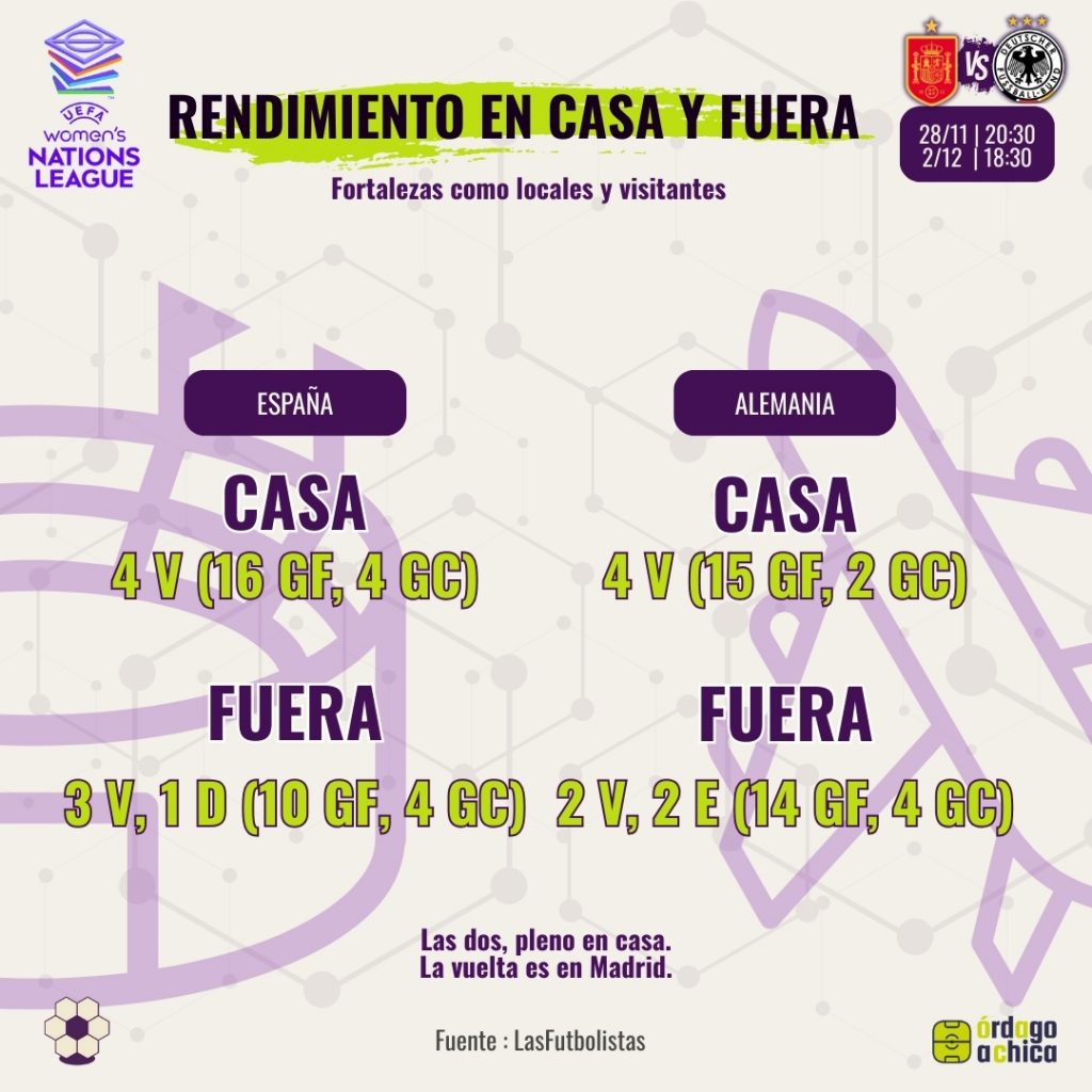 Alemania se ha dejado puntos fuera, España no: 3V y 1D. La ida en Alemania puede ser más igualada, la vuelta en Madrid pinta a entorno muy favorable para España.
